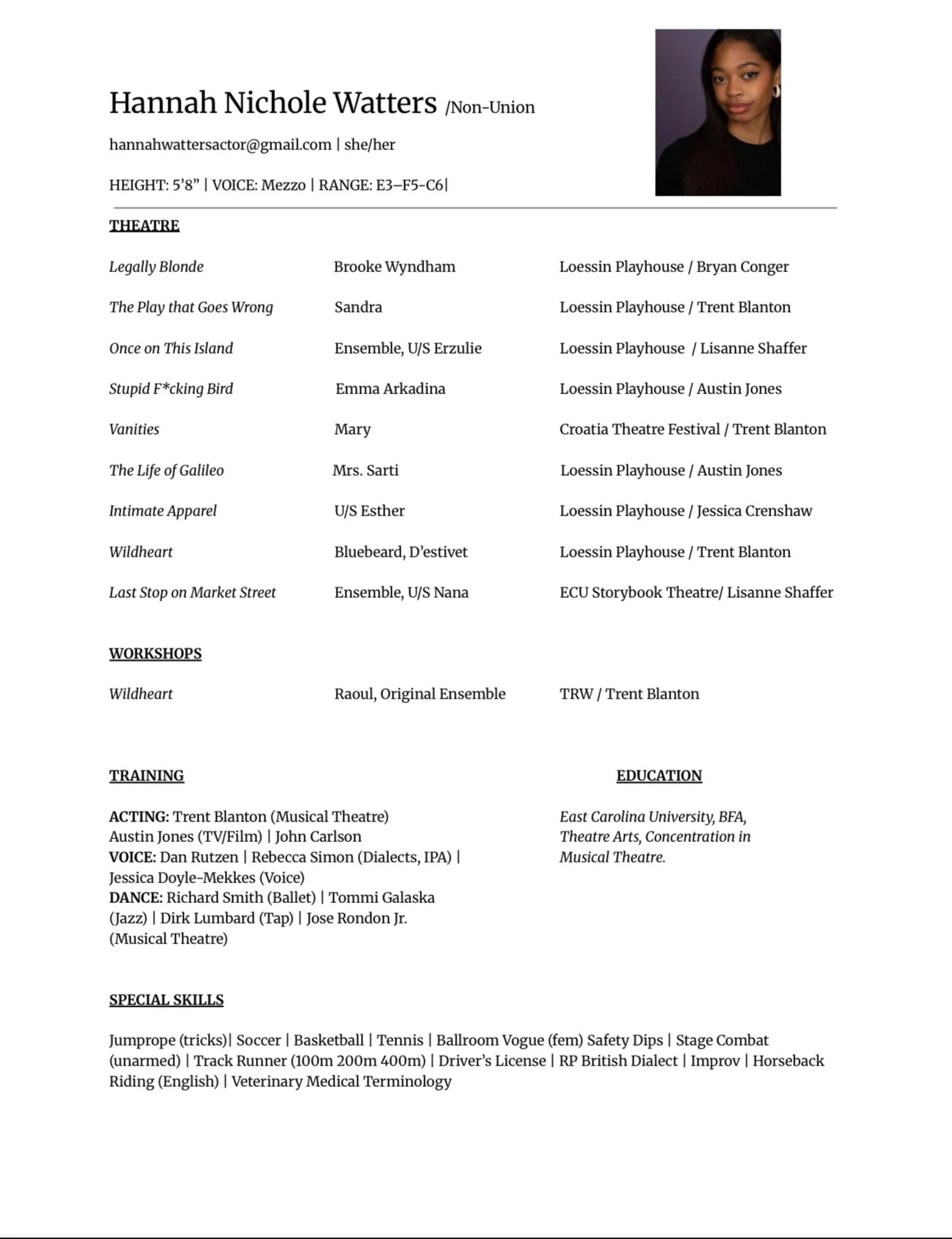 Hannah Watters (she/her) is a singer, dancer, actor based in Raleigh, North Carolina. She is currently earning her BFA in Musical Theater, and estimated to graduate in the Spring of 2026. Hannah has been singing since before she could talk, though she quickly favored a soccer ball, basketball, tennis ball, track shoes, volleyball… you get the idea. It took until the age of 16 for her to spark her true love for Musical Theatre, having a true “Troy Bolton moment,” as she’d say, proceeded by an awkward laugh. When she’s not on the stage, you can find Hannah painting, going on a run, or toting her fur baby bunny Clover around town.
